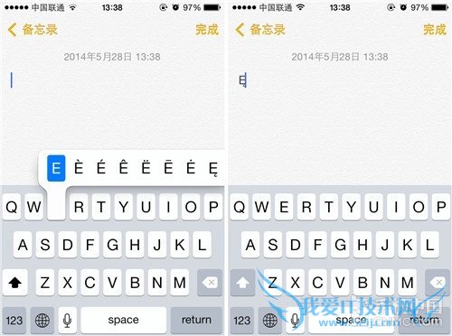 第三步:长按字母就可以看到字母上方显示的字母特殊字符,我们从中选择需要输入的特殊字符即可。以字母E为例,除去大写字母E外,相关的特殊符号还有7种,是不是觉得很有意思呢?