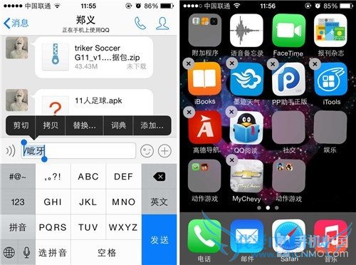 第二步:选好之后我们就可以退出QQ了,之后选中某个应用文件夹,长按该文件夹几秒,该文件夹就会晃动起来,之后打开应用,点击上方右侧的删除图标,删除文件夹名称,之后点击屏幕然后选择粘贴前面拷贝的内容。