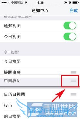 4)但很多人发现在通知栏里的日历位置太靠下了,想改变下通知栏里的显示效果。大家可以点击右上角的“编辑”按钮,然后手按住“三”的菜单进行上下拖动既可改变通知栏显示位置。