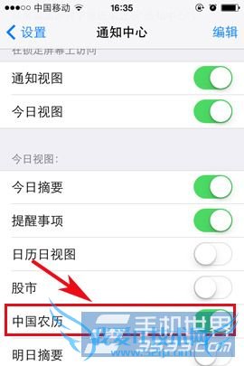 3)待安装后点击“设置”,然后进入“通知中心”。大家就能在通知中心看到“中国农历”的插件了,在“今日视图”里点击开启该“中国农历”即可。