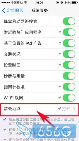 3)在【系统服务】界面就能看到【常去地点】功能了,点击进入后对【常去地点】栏的功能按钮进行关闭即可。(如下图所示)