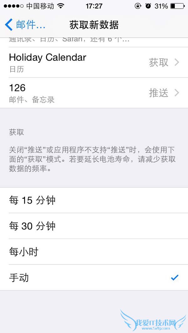 路径:设置——邮件、通讯录、日历——获取新数据——手动