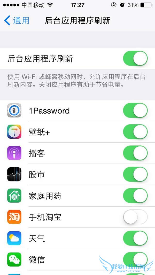 禁用后台程序刷新设定路径:设置—通用—后台应用程序刷新—关闭一些不需要后台刷新的应用程序。