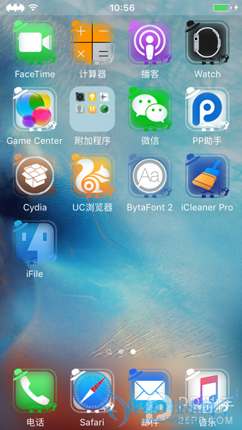 然后,下载iOS9越狱蒙版图标,解压文件后打开PP助手电脑版,连接设备并在文件系统(越狱)中找到路径【/Library/Themes】,导入已解压好的蒙版图标文件夹;