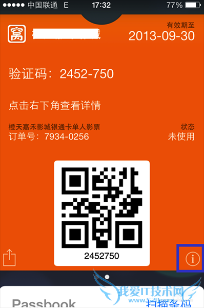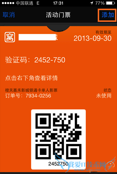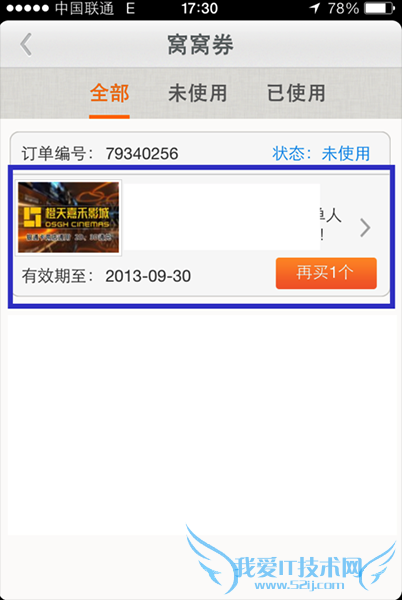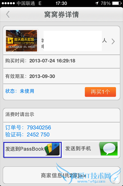 2、在已经购买的团购劵中点击要添加到 Passbook 中的电影票,如图所示
