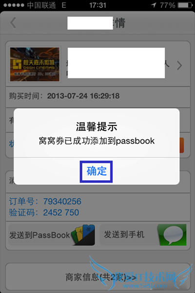 5、最后会提示已经把电影劵成功添加到了 Passbook,点击“确定”继续,如图所示