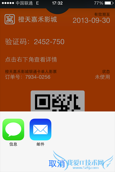 4、另外还可以把票券用短信或者邮件来发送给朋友,如图所示