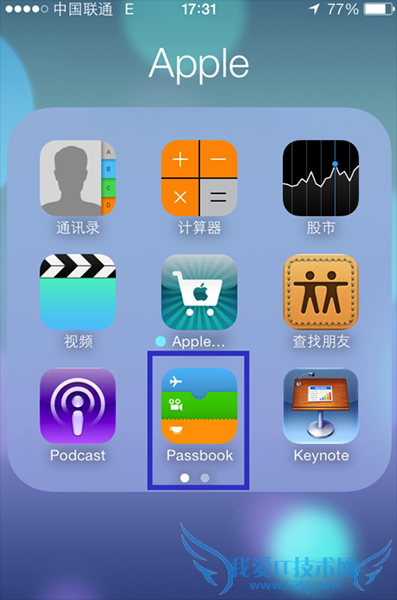 1、这里以 iOS 7 系统为例,找到 iPhone 上的“Passbook”应用图标,点击打开,如图所示
