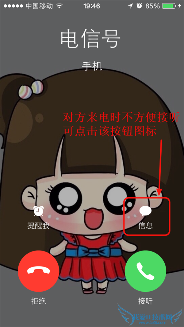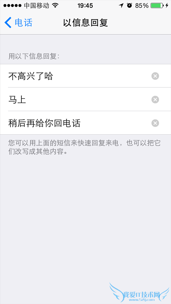 当对方来电你不方便接听时,iOS8提供了一项“以信息回复”的便捷处理办法。即是说来电拒接,但是马上给对方发送一条预设的短信内容,以示礼貌和告知当前自己不方便接电话。实现方法如下: