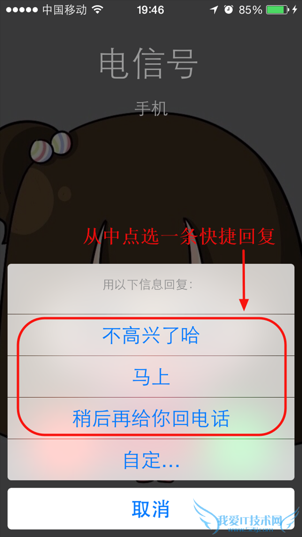 然后从预订的短信条目中点选一条,此时来电即会被挂断。随即信息也会发送到对方手机上。