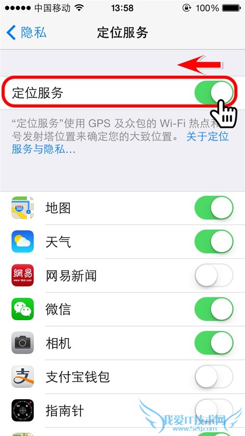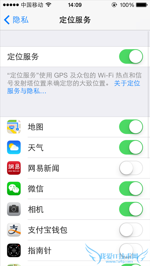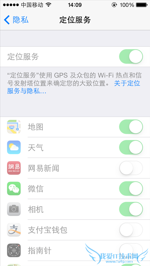 第4步:在定位服务中,位于最上面的是定位服务的总形状,点击右侧的滑块可以把整个定位服务关闭。在下方是当前手机中涉及定位服务的应用列表,蓝色表示该应用定位服务已经打开,点击开关可进行单一程序的关闭或打开;