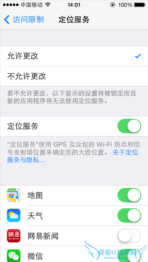 第7步:进入定位服务详细设置,关闭定位服务按钮。注意对比一下与方法一中的区别。除了下方的的总开关和应用程序分项开关外,在最上面还多了一个锁定选项,用户可以选择“允许更改”或“不允许更改”。当选择不允许更改时,即进入加密状态。无论是对总开关或应用程序的分项开关的设置,都将被锁定,普通用户通过方法一用修改隐私选项的方法将不能修改定位服务。