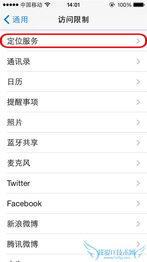 第6步:设置密码成功后,“访问限制”将可以使用,此时主列表中的程序项目均可以修改。向下滑动列表,找到隐私选项中的“定位服务”;