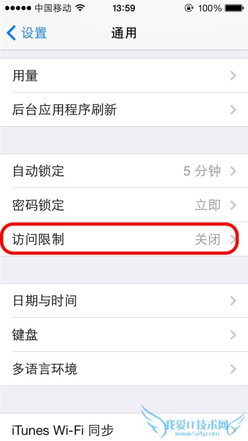 第2步:在“通用”设置中,找到“访问限制”。默认状态下,该项目为关闭状态,接下来我们要把该选项打开,点击进入;