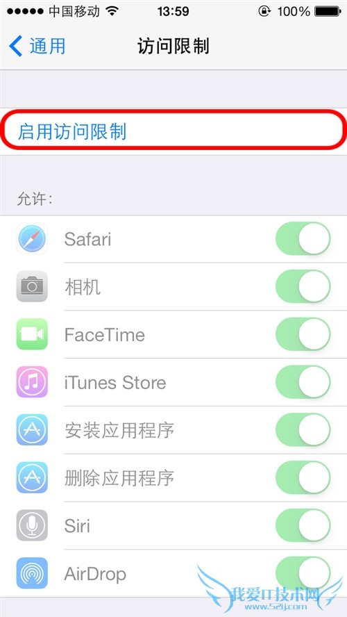 第3步:进入“访问限制”,此时我们会看到主列表中有许多应用程序是灰色的不可用状态,要想修改,首先点击上方的“启用访问限制”按钮;