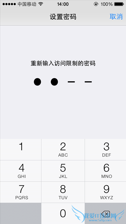 第4步:由于“访问限制”权限很大,将影响到很多重要的设置,所以为了安全起见苹果强制要为其设置四位密码。按小键盘可输入密码,为防止旁边有人偷窥,密码在手机上将统一以点显示;