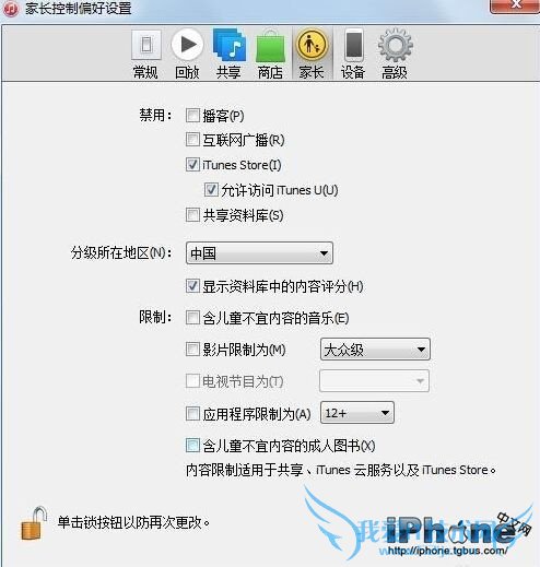 4、通过iTunes的偏好设置进行修改,改变家长配置选项中的禁用,将iTunes Store禁用,但可访问iTunes U,这样就无法访问iTunes了,然后关闭iTunes,再重启该软件,最后再将家长选项中的iTunes Store禁用取消,很有可能解决无法访问iTunes Store的问题。