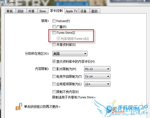 有部分果粉反映到以上步骤仍是无法进入iTunes store,那么,在进入itunes后,点击编辑,然后偏好设置,在家长控制中先禁用iTunes Store, 但是允许访问iTunes U, 确认后,回到Itunes,应该可以进入iTunes U。