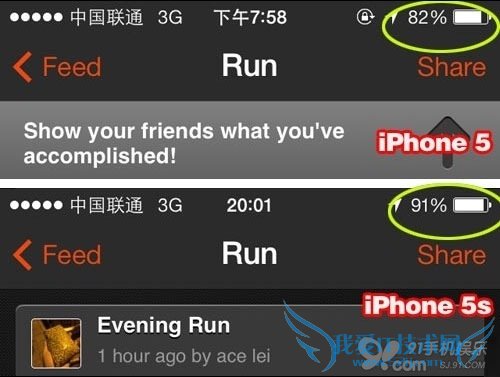 同样的时间和距离,同样的使用条件,苹果iPhone 5s与iPhone 5在记录运动轨迹的功能上电量有9%的差距。在实际测试过程中笔者感觉随着里程的增加,iPhone 5的掉电速度变快,而5s的掉电速度比较平稳。M7的实际表现基本与宣传的特点保持了一致。