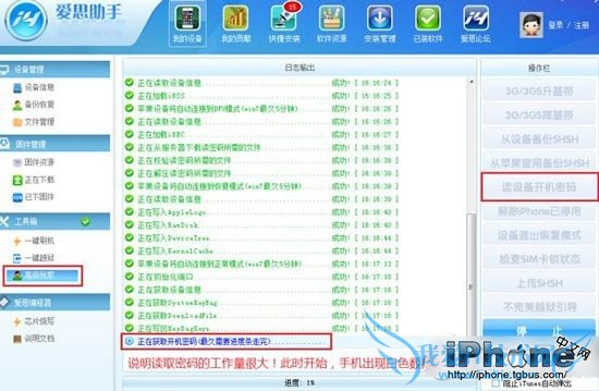 设备一旦进入到DFU模式,爱思助手立即开始“获取开机密码”!显示如下: