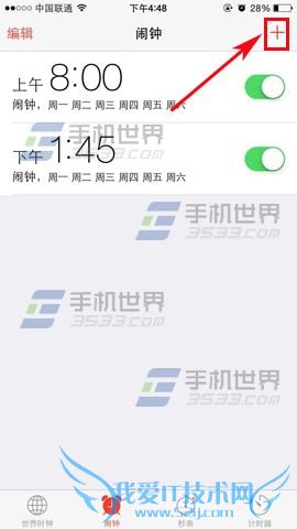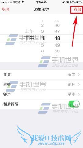 2)打开闹钟后点击右上角的【+】号,添加闹钟,然后设一个你所需要的闹钟,设完后最后点击右上角的【存储】就可以了!(如下图)