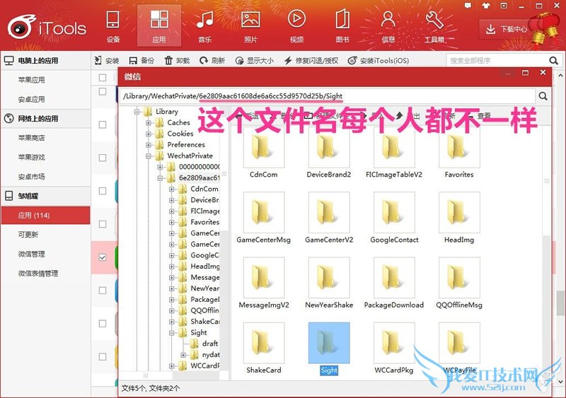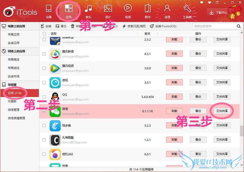 2.在电脑上连接手机,打开iTools 选择 应用-应用-文件共享。