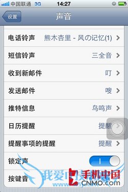 点击声音后,用户在这里可以设置手机的铃声大小、震动,选择与众不同的音乐作为铃声和短信提示音。在待机时,用户也可以直接按音量键来设置铃声大小,或者拨动静音开关来直接将手机调成震动模式。在墙纸选项中,用户可以自定义设置锁屏和待机壁纸。