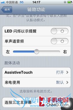 细心的朋友可能会发现上文中手机的屏幕里总有一个方形的标识,这个是iOS 5新增的功能,在通用——辅助功能中就可以打开。打开后的浮动方块可以自由移动至屏幕四周,以防止其妨碍日常操作。这个功能方便减少用户使用物理HOME 键的次数,从而在一定程度上解脱了易损坏的HOME键,也加强了iOS的手势操作功能,另手机更智能。