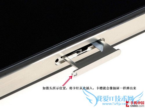 如上图箭头所示,用卡针往卡槽的小洞中往里按,就可以将卡槽顶出来。笔者在此提醒一下大家,如果你用的是剪过的SIM卡,那么请将卡的尺寸剪好再放进去,如果有毛边的话请进行修整后再放进去,否则容易造成以后UIM卡槽无法顺利弹出的情况,更严重的需要拆机才可取出。