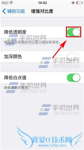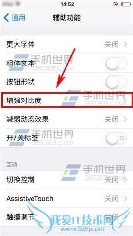 2)在辅助功能界面点击【增强对比度】,进入后关闭【降低透明度】右边滑块即可。(如下图)