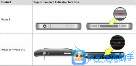 每部iPhone都配备了多个传感器,与液体接触后就会变成红色。如果它们变红了,那么,这部iPhone大多是进过水了。你可以依照下图检查一下指示标(这是苹果的图):