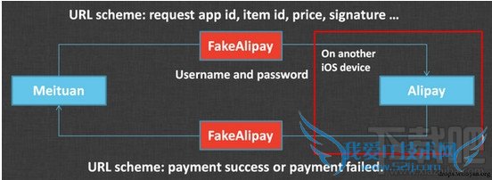 在正常的支付流程中,某个App(视频上是美团)首先将订单信息通过URL Scheme发送给支付宝(Alipay),支付宝收到订单信息,调用支付界面,用户在支付宝上完成支付后,支付宝再发送一个URL Scheme给美团,美团收到付款信息后,显示团购成功的界面。