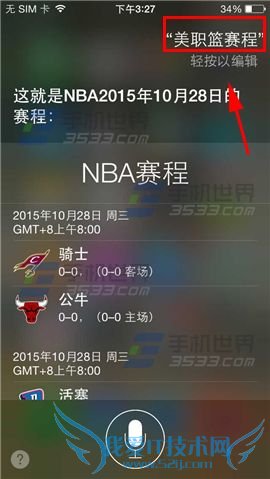 按住Home键唤出Siri,对着麦克风说【美职篮赛程】,接着就会显示出当下的赛程,(注:有网络的情况下才能使用Siri,开启Siri方法请参考相关教程)(如下图)