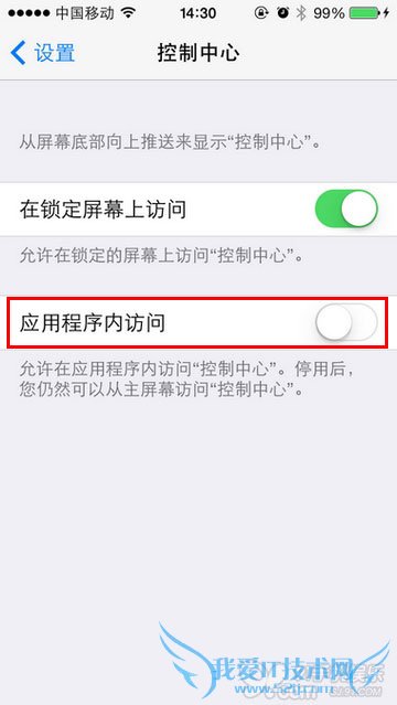 禁止在应用程序内访问iOS7控制中心:【设置】->【控制中心】->关闭【应用程序内访问】开关