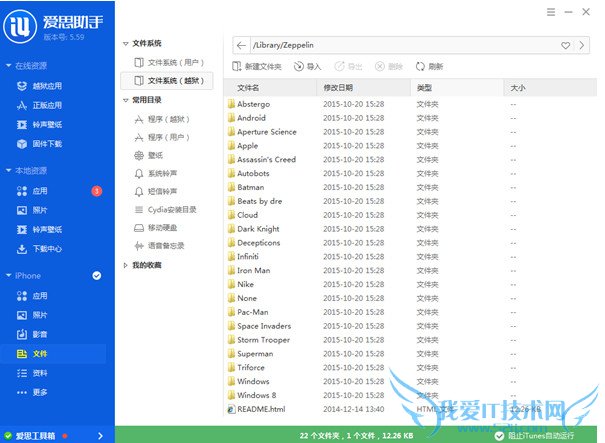 3、下载“心电图”图标(地址),解压后打开爱思助手电脑版,设备成功连接之后在文件系统(越狱)中找到路径【/Library/Zeppelin】,导入“心电图”图标文件,返回设备【设置-Zeppelin】勾选即可。