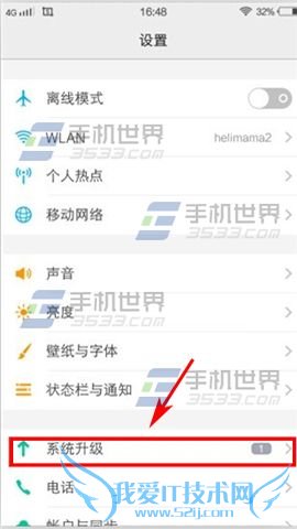 1)首先我们先打开【设置】,然后找到【系统升级】。(如下图)