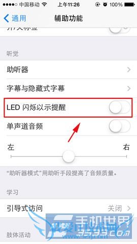 2)在辅助功能里,找到“LED 闪烁以示提醒”,然后打开右边的开关,设置完后苹果iphone5c来电闪光灯就设置成功了。