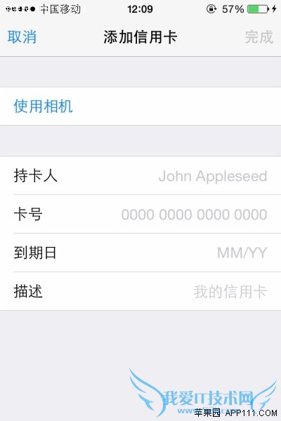 第三步,在“添加信用卡”页面,点击“使用相机”,将中间的白色框对准信用卡,就能自动识别出卡号、有效日期和持卡人,并能自动填上描述了。