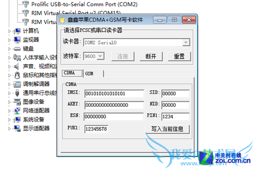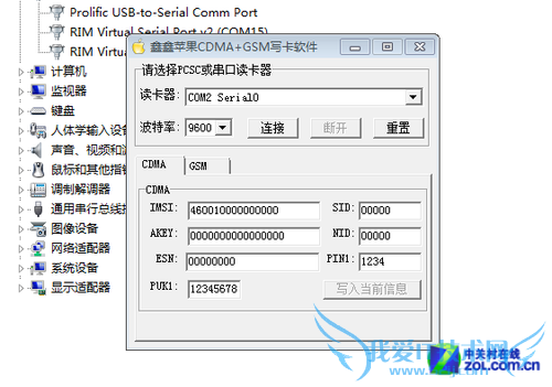 这里注意笔者选择的波特率为9600,因为过快的速率可能会导致凤凰读卡器读取双模卡失败。同时读卡器区域会显示已经连接好的凤凰读卡器端口,并默认CDMA端。之后在IMSI部分输入:001010101010101.此时点击连接按钮,之后点击“写入当前信息”按钮。