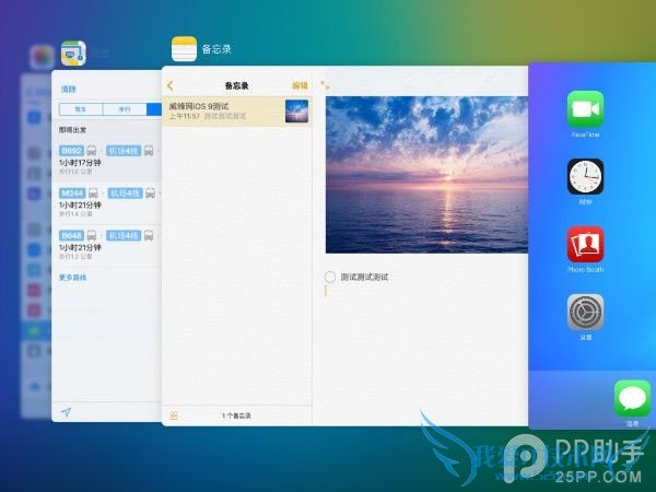 说到多任务功能,说它是 iOS9 最大的亮点功能应该没有什么人会反对,这也是我们选择使用 iPadAir2 作为测试 iOS9 Beta 的一个原因。多任务功能只支持较新的 iPad 设备,给作为生产力设备的 iPad 配备多任务功能,苹果似乎是想给 iPad 日渐下滑的销量提振。简单来说多任务功能分为 3 项,分别是 SlideOver,Split View 和画中画。