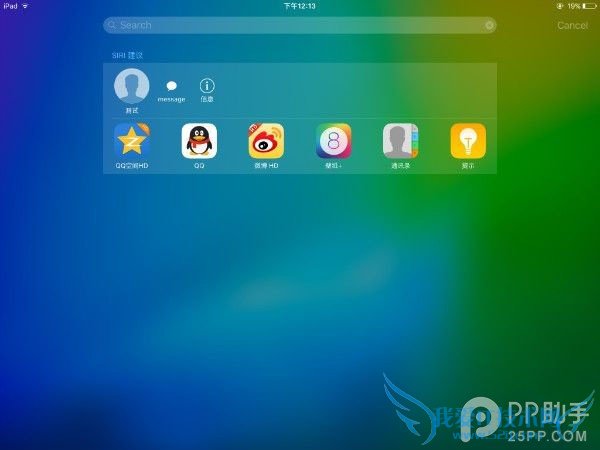 在全新的 Spotlight 下方我们还可以看到苹果为其新增的 Siri 建议,包括了建议联系人和建议应用,点击相应的联系人可发送信息(iPhone 的话还可以拨打电话),这里不得不提到苹果在 iOS8 多任务卡片上方加入的快捷联系人方式,在 iOS9 的全新翻页式多任务界面中,已经看不到快捷联系人的存在。