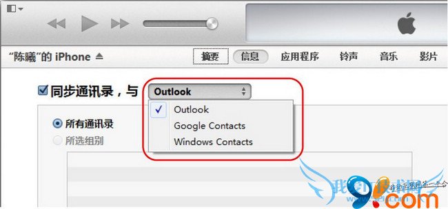 3.iTunes同步“通讯录”支持多渠道数据,同步的来源支持Outlook、Google contacts及Windows contacts。