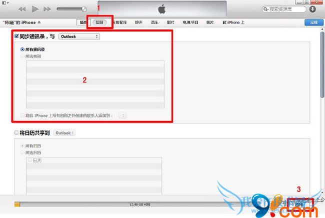 2.以同步Outlook数据为例,在iTunes摘要页面,点击进入“信息”,在信息中勾选“同步通讯录”,数据来源选择Outlook,点击“应用”,完成后iTunes会自动将联系人合并同步至iOS设备中。需要注意的是OS X系统版的iTunes不支持该同步方案。