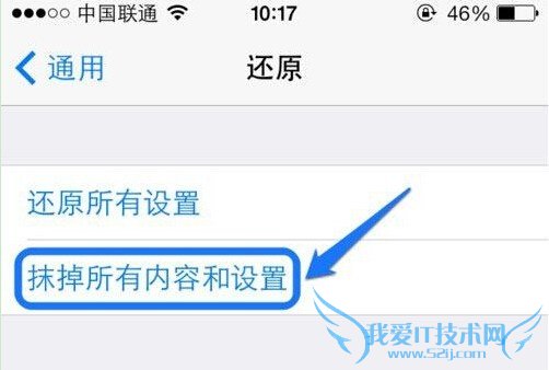 3、进入“还原”页面,想要恢复出厂设置的话,选择“抹掉所有内容和设置”。