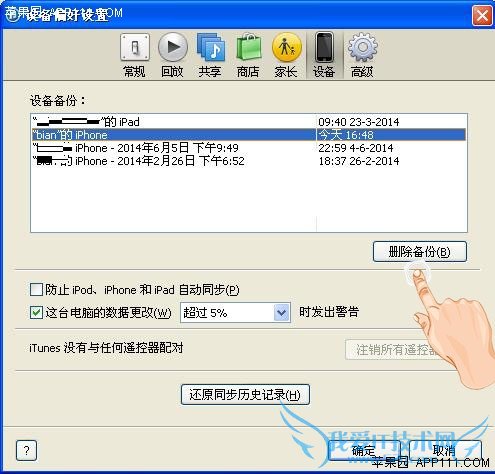 第二步,在偏好设置页面,点击进入“设备”选项。 第三步,在“设备偏好设置”页面,选择需要删除的设备备份,然后点击“删除备份”。