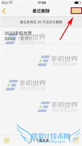 1)进入备忘录界面,点击【最近删除】,再点击右上角【编辑】。(如下图)
