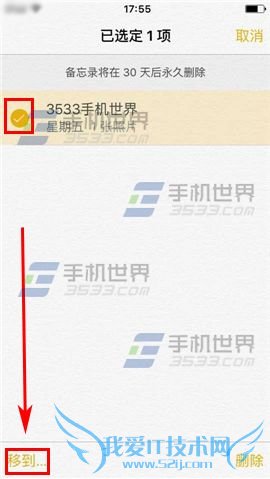 2)勾选需要恢复的【备忘录】,再点击【移到】,选择备忘录的存放位置即可。(如下图)