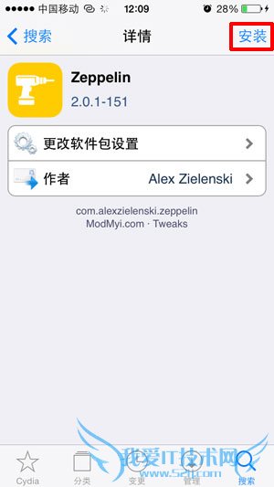 打开Cydia,进入【搜索】界面,在搜索框中输入Zeppelin,安装它,如右图蓝框中所示,Cydia会自动附带安装上一些必备的依赖包,其中就包括了Cydia Substrate,接着请【确认】安装,自动安装后,点击【重启SpringBoard】(即是注销,请勿将注销界面当作是白苹果,不同机型注销时间会有所不同)