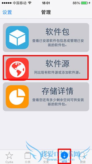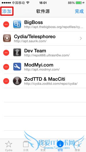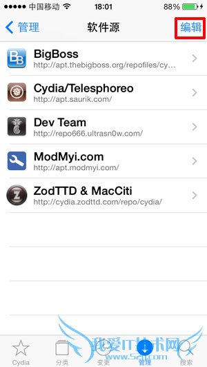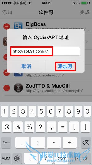 打开Cydia,依次点击【管理】—>【软件源】—>【编辑】—>【添加】—>输入源地址http://apt.91.com/7/—>点击【添加源】。