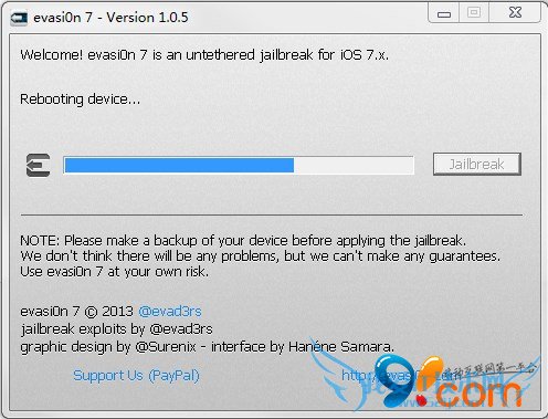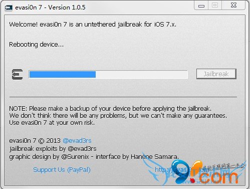 1.13更新:iOS7完美越狱工具Evasi0n7更新至1.0.4,或解决部分机型出现无限重启问题,主要是修复一个在越狱后出现的“重要安全漏洞”。点击查看详情。